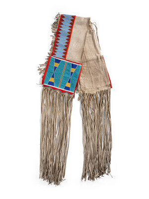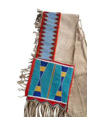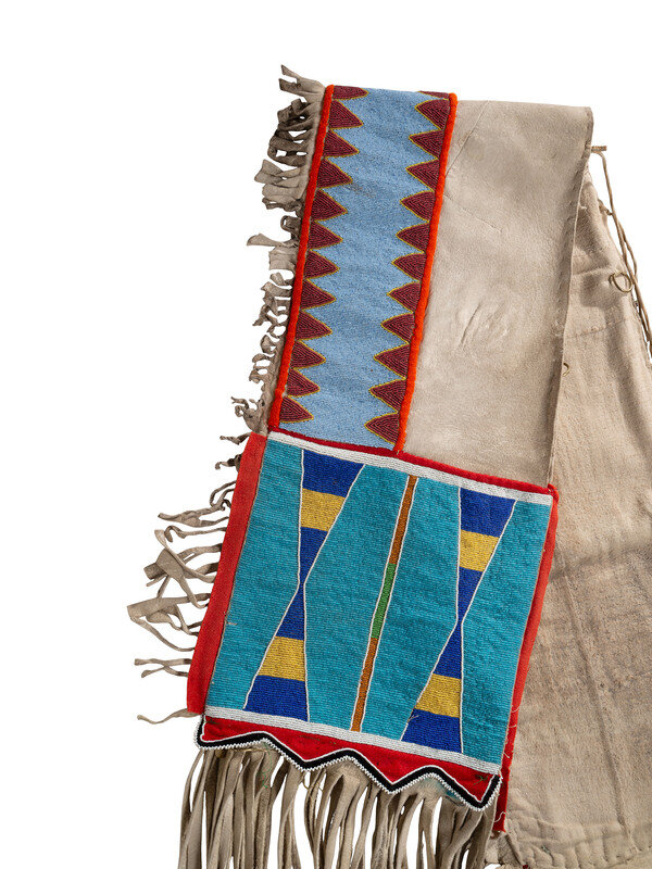 thread-sewn and beaded using various blues, red white-heart, and greasy yellow; red trade wool