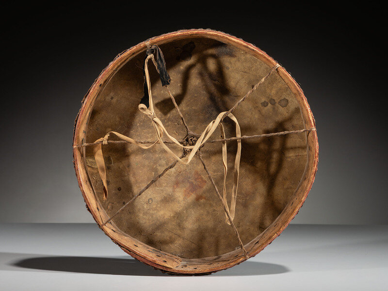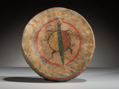 bentwood frame covered with hide; a turtle, divided by colors, is surrounded by concentric circles; inked on interior: Geo. McDonald Gave 1910; with paper tag: L2004.310.3 Channing