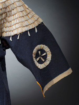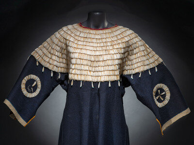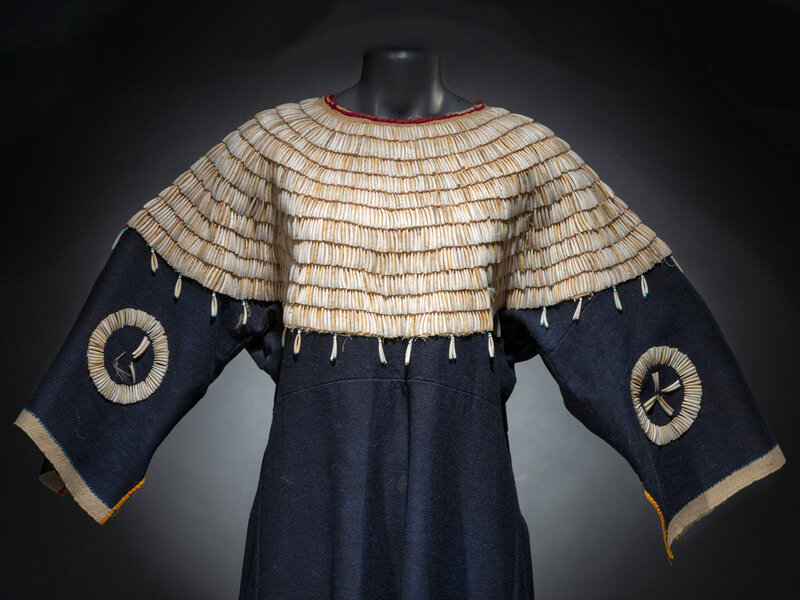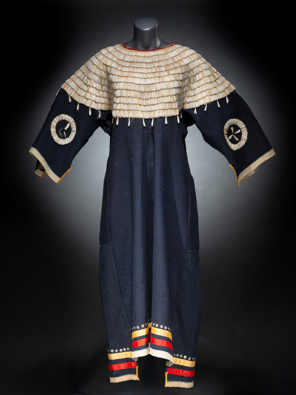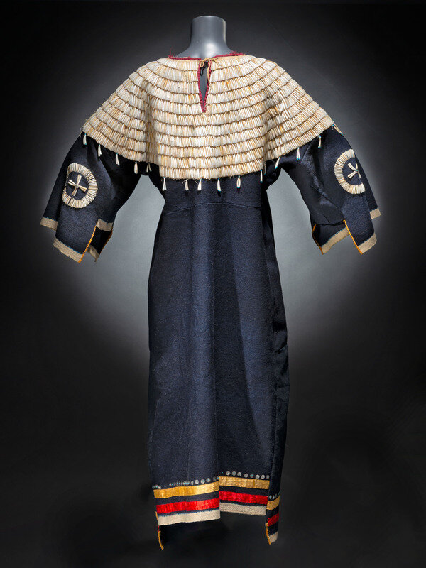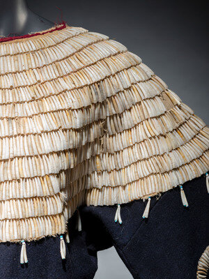 navy trade wool body; 11 rows of dentailium shells create the yoke of dress; dentalia shell medallions containing crosses on sleeves; ribbon and sequins along lower hem