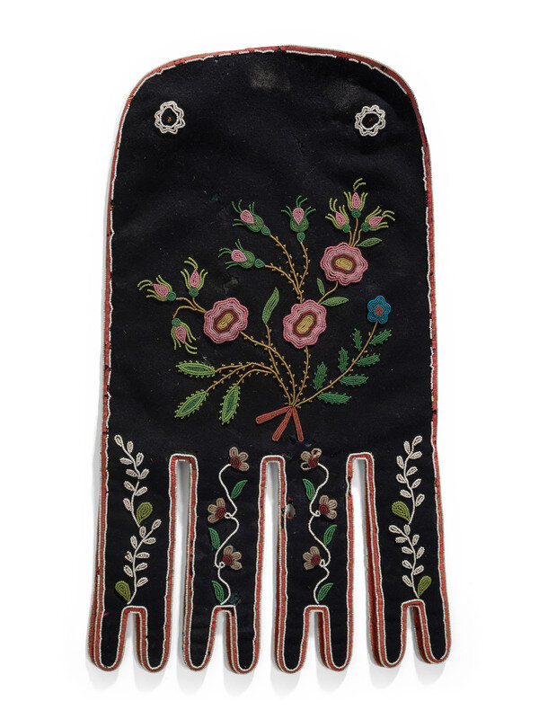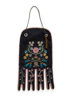 black felt decorated with small glass beads that create a delicate floral motif; lined with blue polished cotton