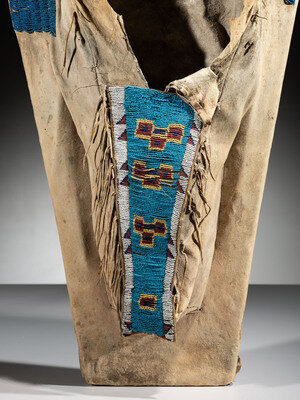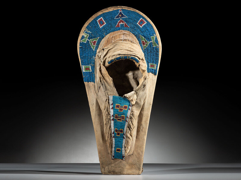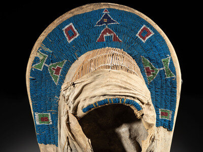 wood frame; thread and sinew-sewn and beaded in colors of pony trader blue, red white-heart, pea green, white, light blue, and cobalt; basketry visor lashed together using hide thongs