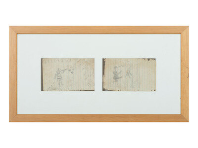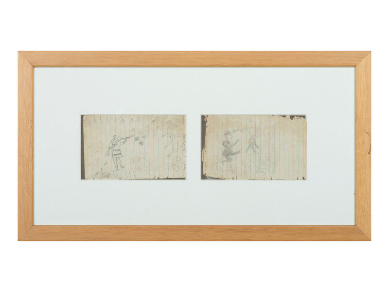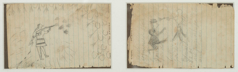 31 drawings in larger frame, plus two front/back drawings in a smaller frame; likely Sioux or Cheyenne, created by two different artists.