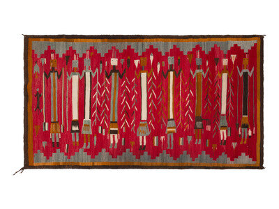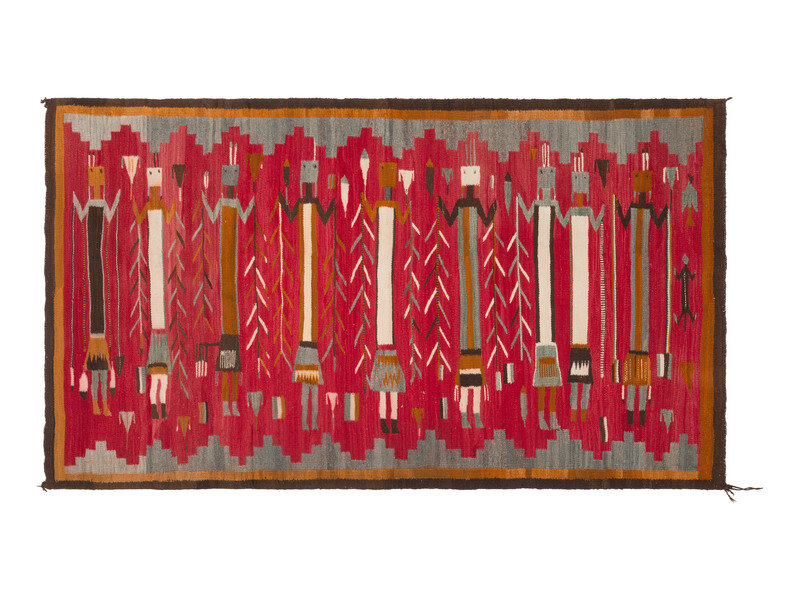 handspun wool woven with colors of red, gray, orange, and cream; nine Yei