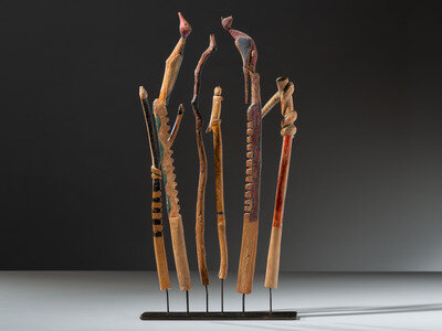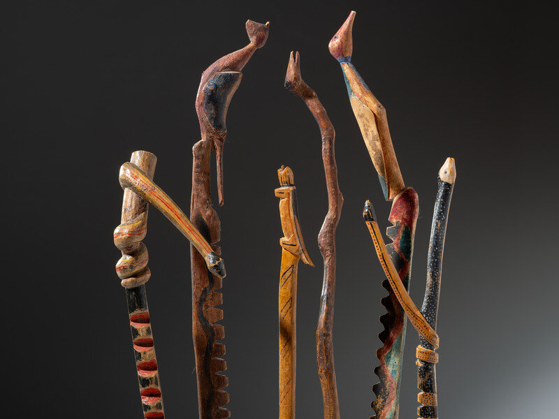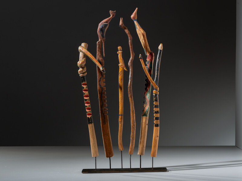 lot of 6, colorful and whimsical carvings, each depicting a unique animal; mounted to stand