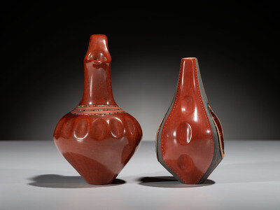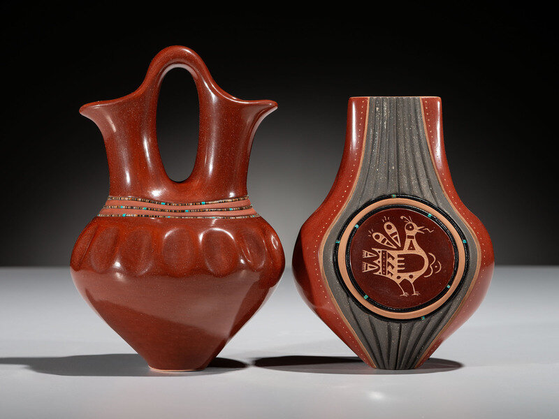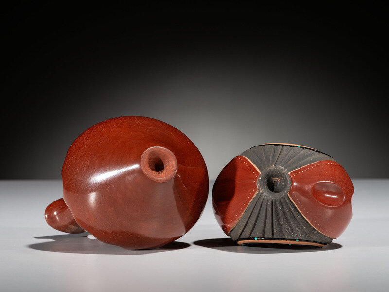 a red, black, and tan micaceous jar with sgraffito decorations; signed on base, height 6-3/4 inches x width 5 inches x depth 3-1/4 inches