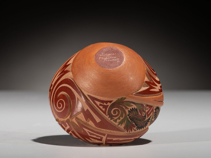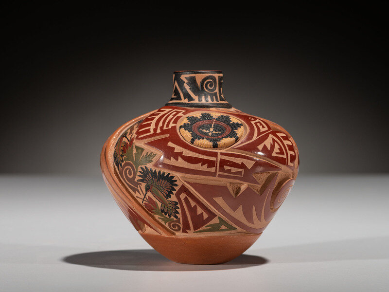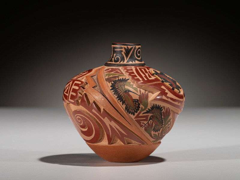 heavily decorated with imagery of wedding baskets, hummingbirds, parrots, and assorted geometrics; signed on base
