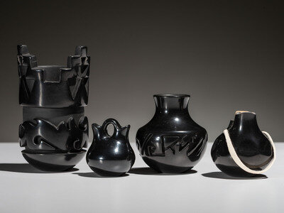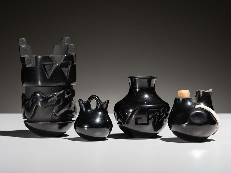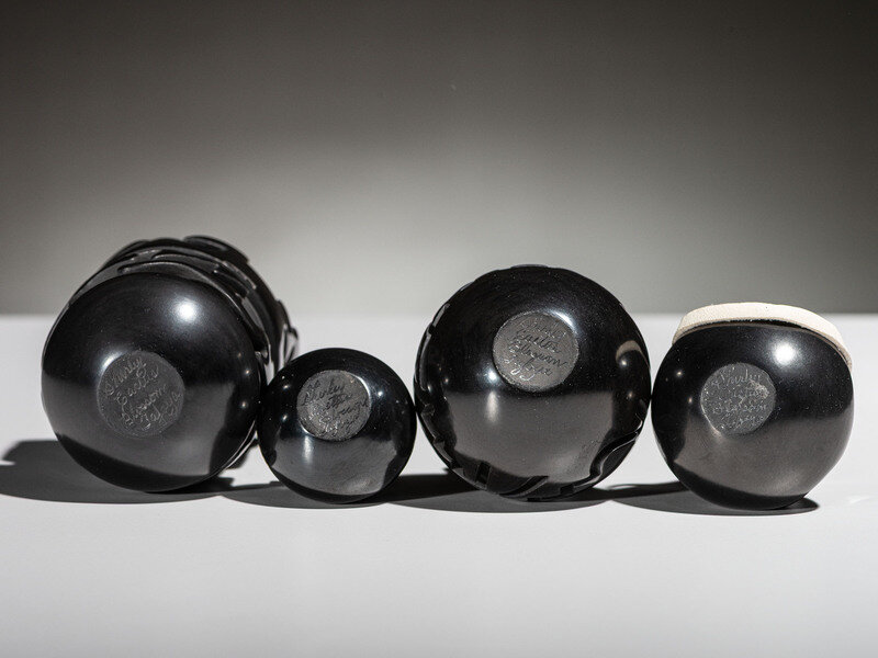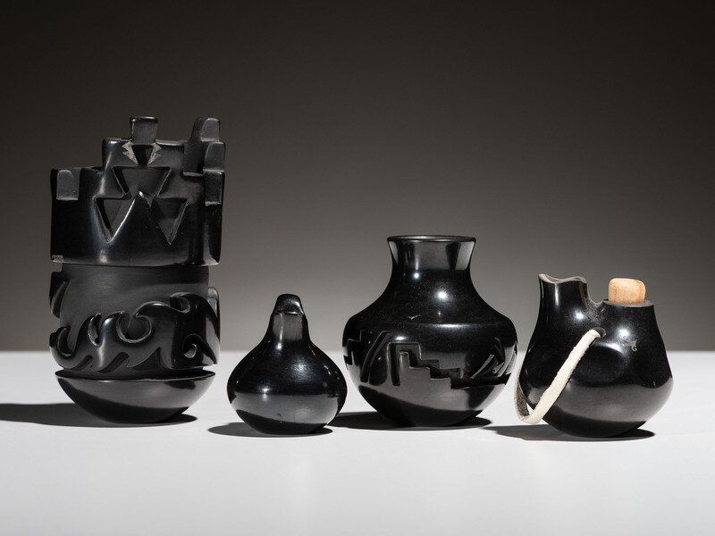 a jar with terraced rim and carved Avanyu, height 4-1/2 inches x diameter 2-1/2 inches