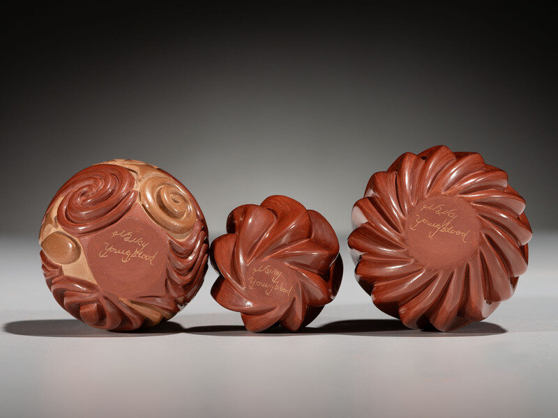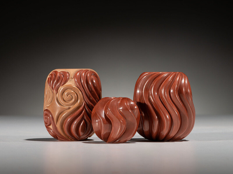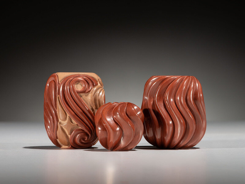 a red and tan jar carved with swirling elements; signed on base, height 3 inches x diameter 2-1/4 inches