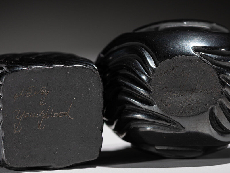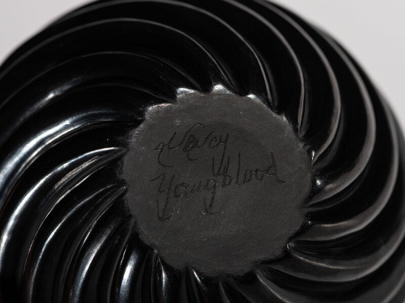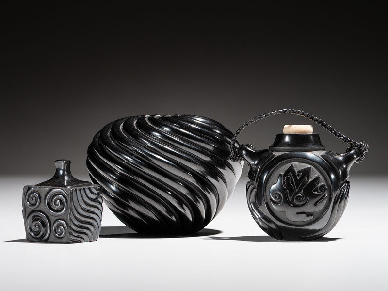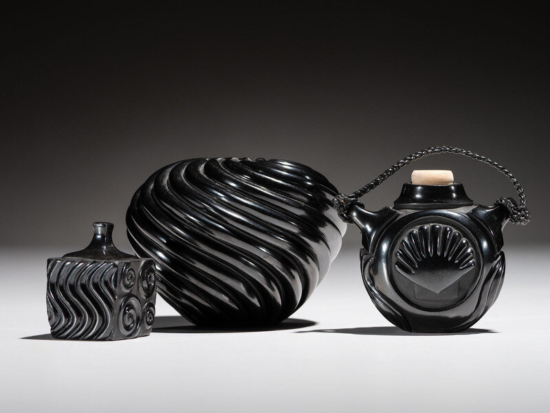 a canteen carved with Avanyu and a seashell; signed and dated 2018 on base, height 3 inches x width 3-1/4 inches