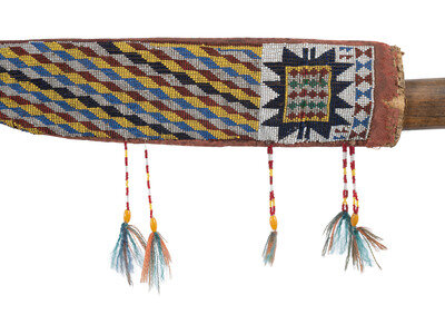 thread and sinew-sewn; hide body covered with panel beaded in colors of cobalt, rose, yellow, medium blue, and white; delicate beaded tassels hang along outer edge; knife fabricated from a file
