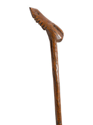 thread and sinew-sewn; designed with lanes of greasy yellow, pumpkin, "exploding blue," white, black, rose, red white-heart, opalescent, and amber glass beads; black and white pony beads edge sides of bag; included is a wood tamper carved with the effigy of a bird