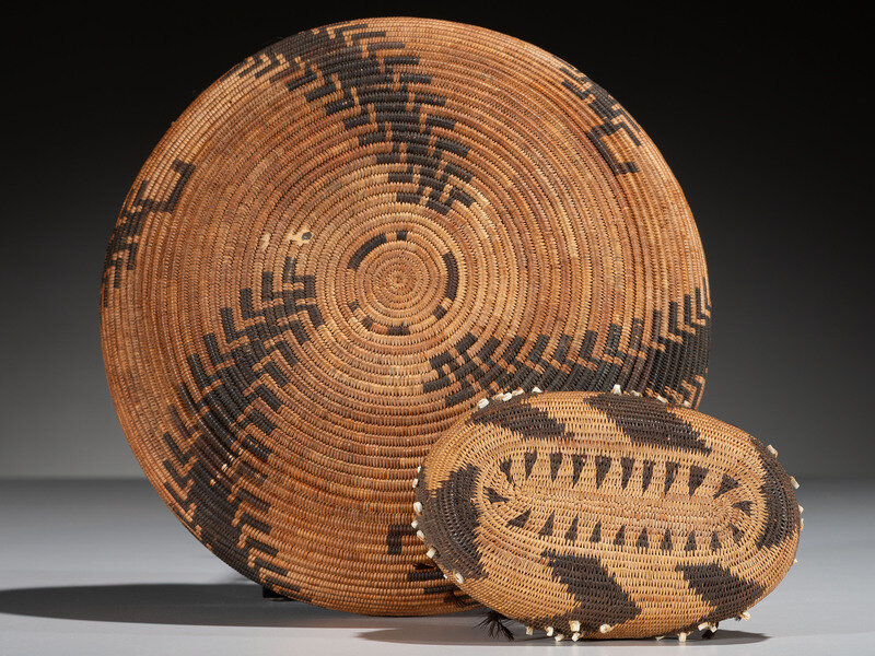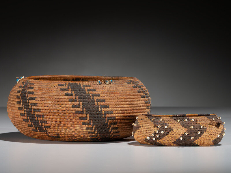 a basket with shell beads and turquoise beads along rim, height 4 inches x diameter 9-1/2 inches