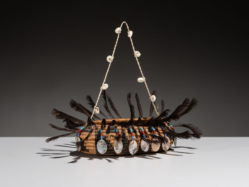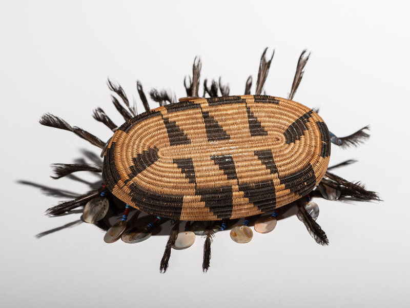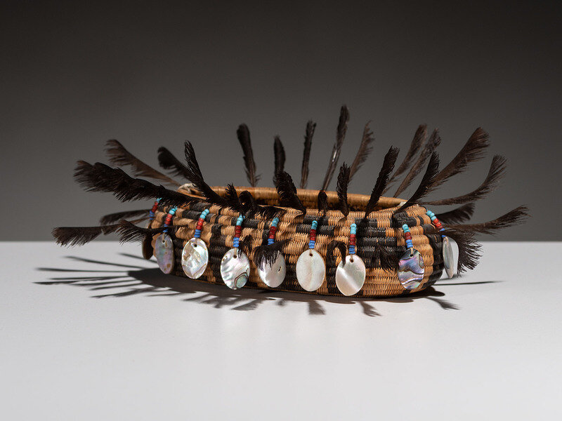 finely woven oval basket, full of personality; beaded fringe finished with abalone drops hang from rim