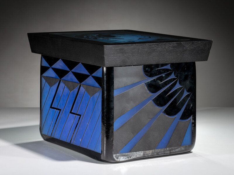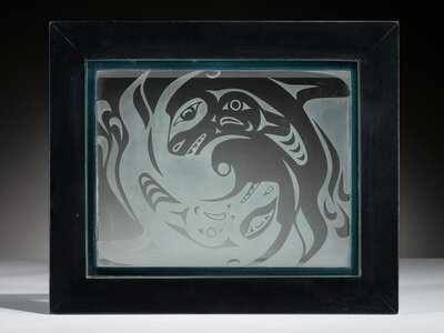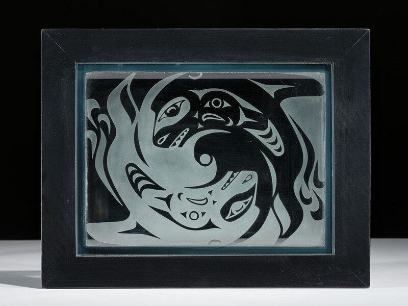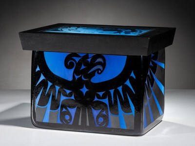 lid with wood frame inset with frosted clear glass depicting two whales; Thunderbird wraps body of box on three sides, lightning and rain on back; signed and dated