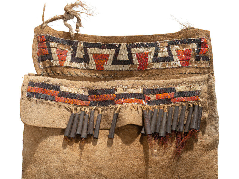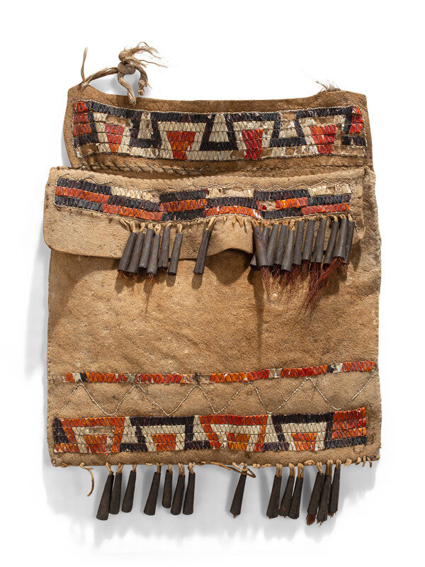 softly-tanned hide with plaited quilled bands in colors of reddish brown, orange-red, and white; tin cones are filled with dyed hair