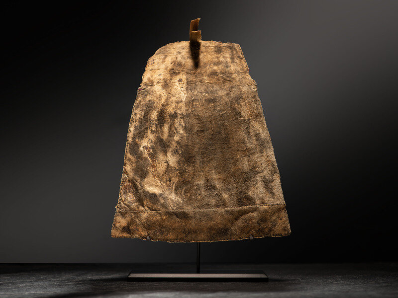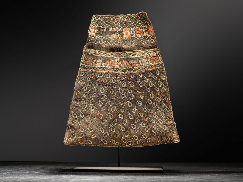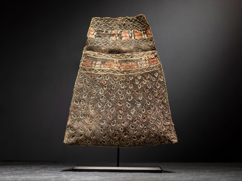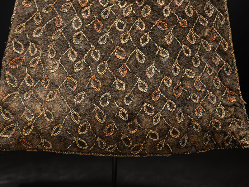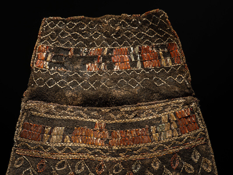 sinew-sewn, softly-tanned hide in a trapezoidal form; quilled in cream, burnt orange, and faded blue with foliate and aquatic imagery