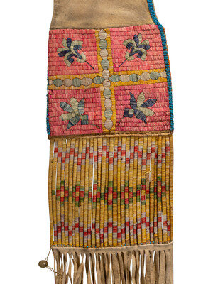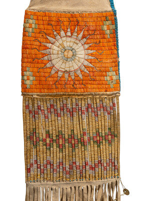 brightly quilled with a floral design on one side and a sunburst on opposite; throat and opening trimmed with blue beadwork