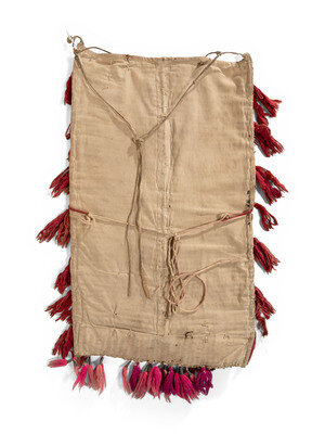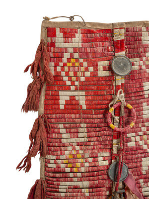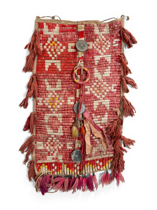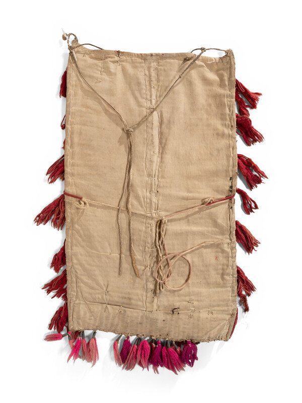 rawhide slats quilled in red, cream, and yellow; mirrors and circular disks are sewn along the midline of breastplate; pink wool tufts; backed with cotton