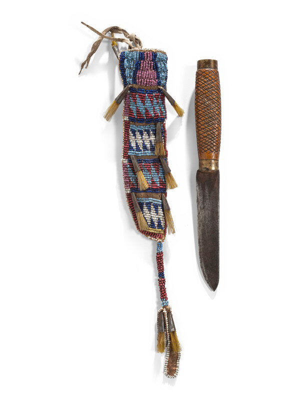 thread-sewn and beaded on softly tanned hide in colors of medium and light blue, red white-heart, pink, and white; tin cone with yellow horsehair; backed with thick, possibly commercially-tanned, epidermis; with a checkered-handled knife, length 9-1/4 inches