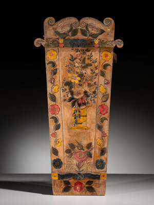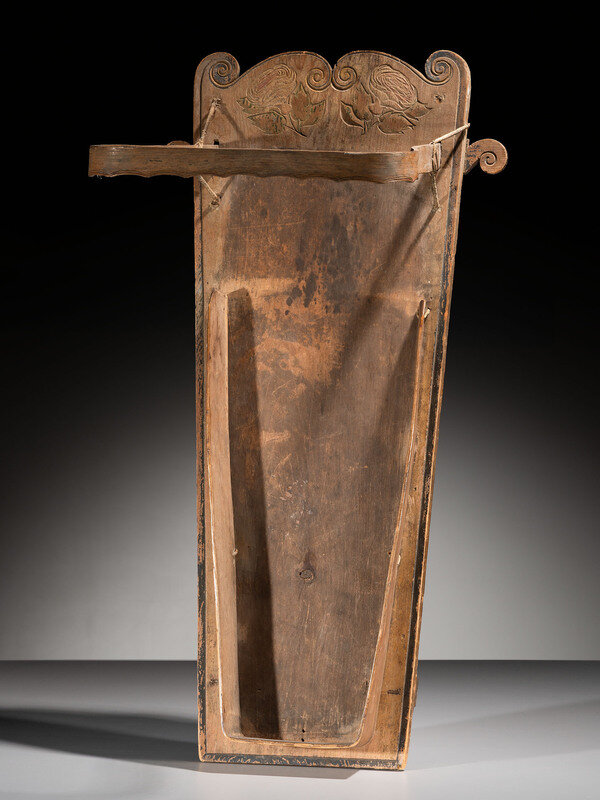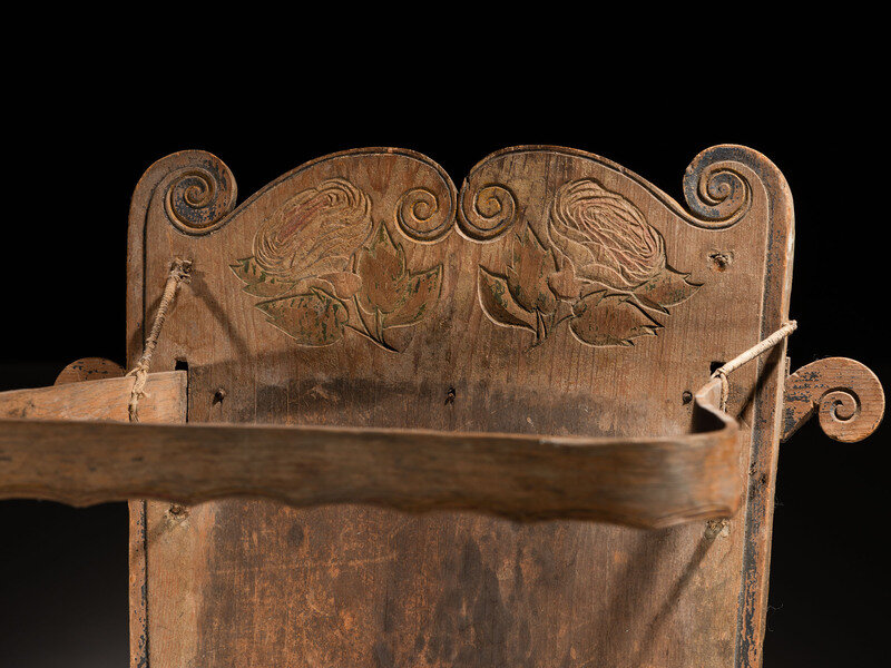 carved of pine; back decorated with an urn filled with flowers, a bird, and a butterfly; roses, once full of color, are placed beneath the scrollwork along the upper edge; bentwood visor frame and footrest
