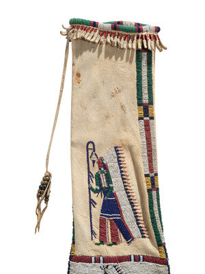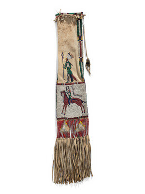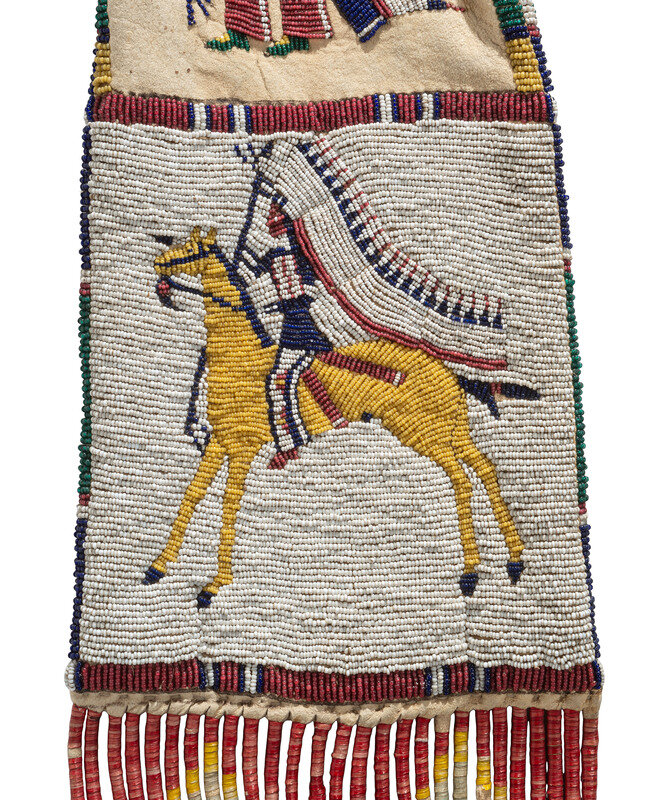 thread and sinew-sewn; beaded with colors of red white-heart, greasy yellow, translucent green, cobalt, and white; each side depicts a horse and rider, and a man holding a society staff and lance