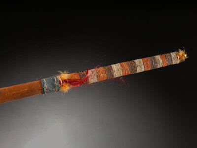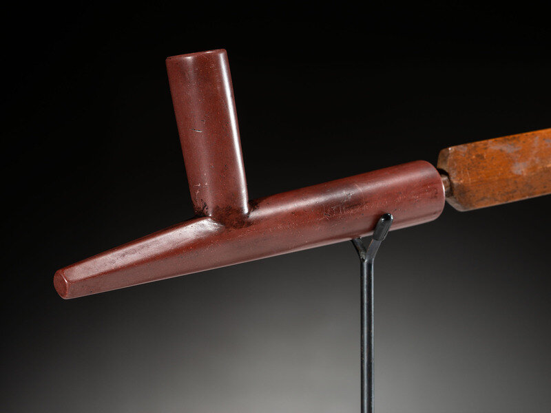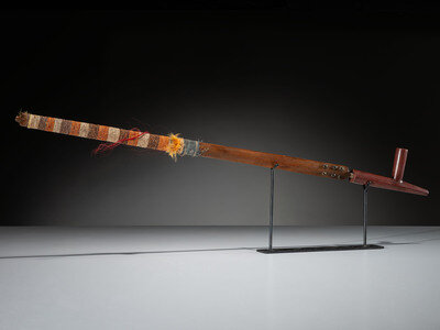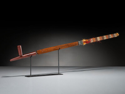 long, flattened stem wrapped with plaited quillwork in colors of cream, red, and a transformed purple (now dark brown); tack embellishments; T-shaped catlinite bowl