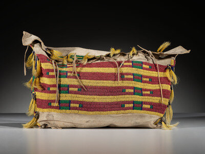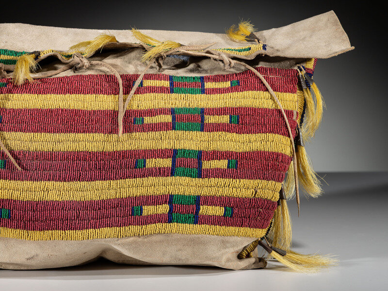 sinew-sewn and beaded with colors of red white-heart, greasy yellow, dark blue, and green; tin cones are filled with yellow horsehair