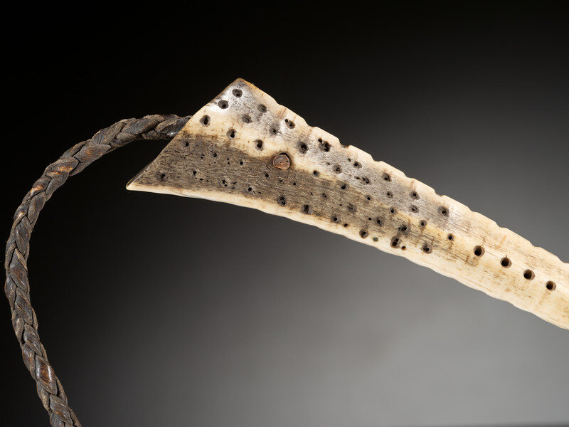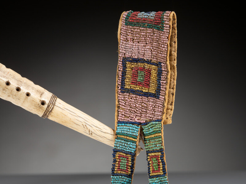 thread and sinew-sewn; beaded using colors of pink, greasy yellow, red white-heart, cobalt, translucent green, and light blue; remnants of cotton backing; antler is decorated with deeply drilled conical circles; braided lashing