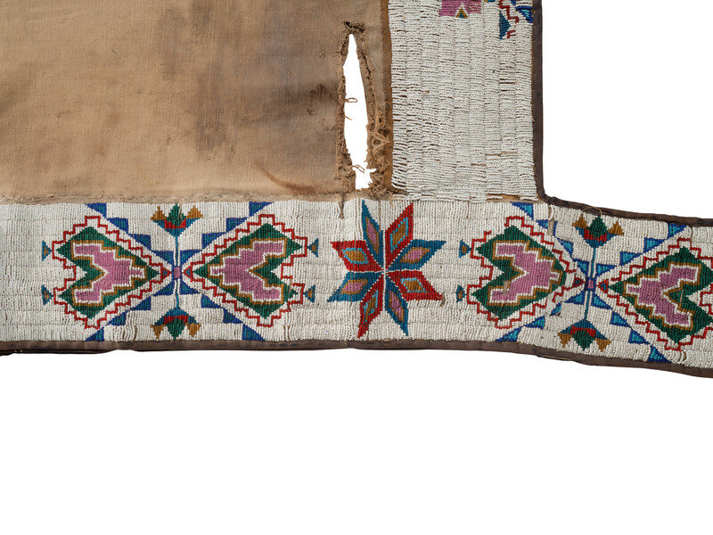 thread and sinew-sewn, panels beaded on Native and commercially tanned hide using colors of white, rose, pink, translucent green, light blue, dark blue, pony trader blue, and amber; canvas central panel