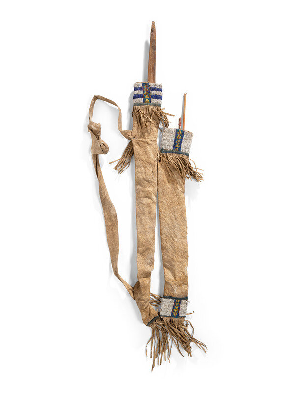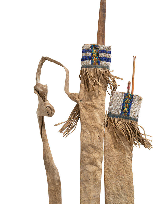 sinew-sewn and beaded in colors of cobalt, greasy yellow, pony trader blue, maroon, and white; with a wood bow and two metal-tipped arrows
