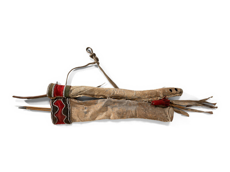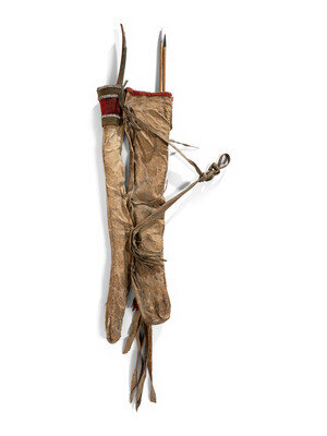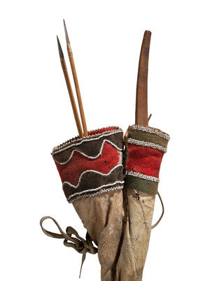 red and khaki wool; white, real-size glass beads decorate openings of bowcase and quiver; length 24 inches