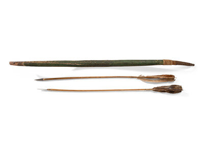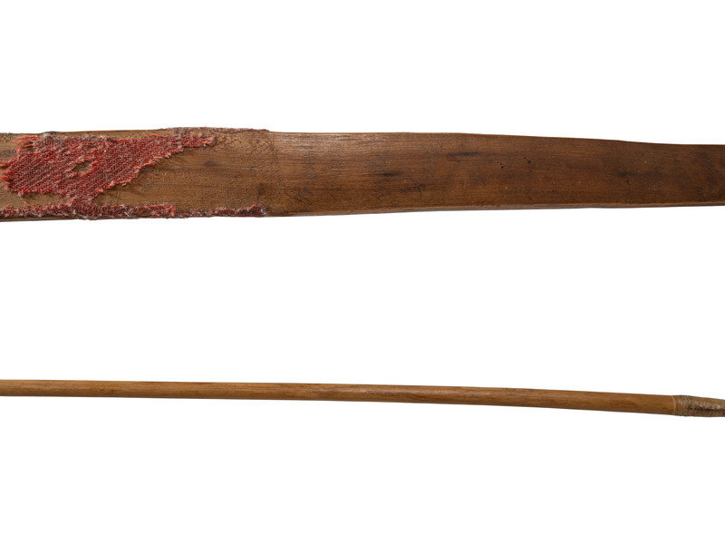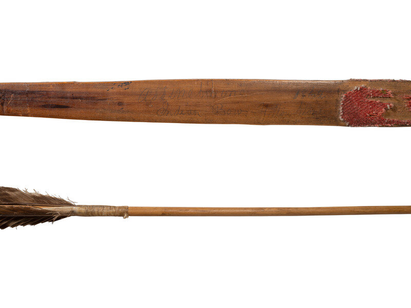 sinew-backed recurve bow painted in green pigment; remnants of red wool at grip; hatched and cross-hatched detailing; penciled inscription Assiniboine Indian Bow / Yellow Stone / 1862 and Present From Uncle Charles, length 29 inches