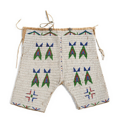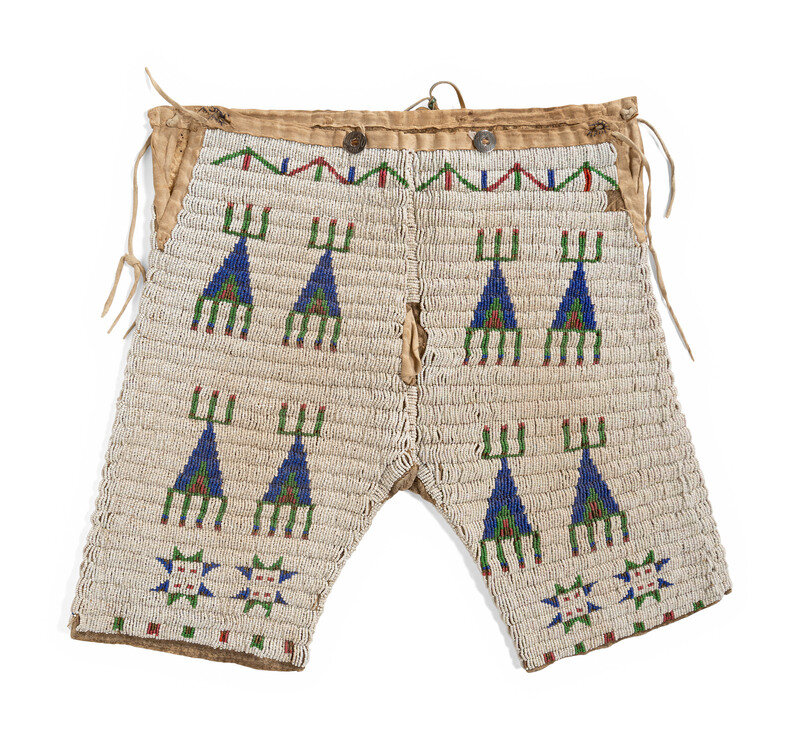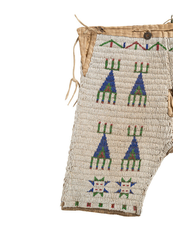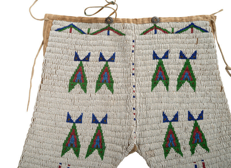 sinew-sewn and beaded using colors of deep green, red white-heart, dark blue, white, and cut brass; with manuscript tag: #159 Mary Nelson Bull Thunder / Cheyenne