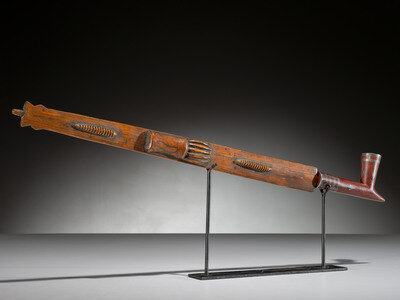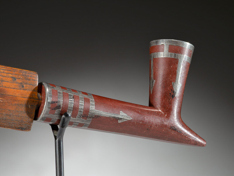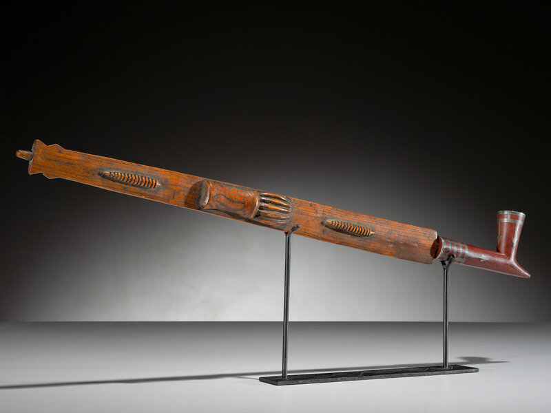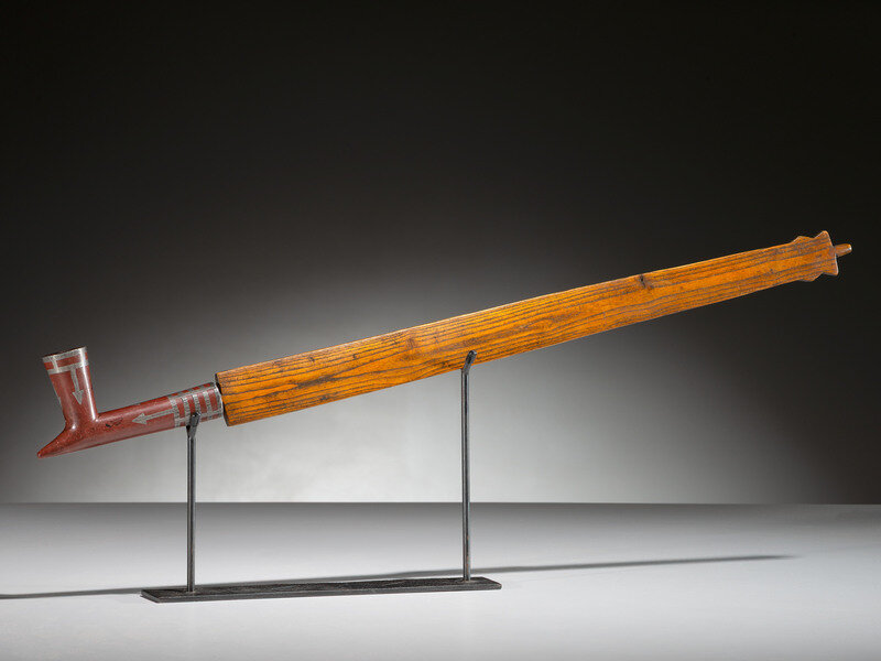 flattened stem deeply carved with two whirlwind worms and a central bear paw; T-shaped catlinite bowl with inlay