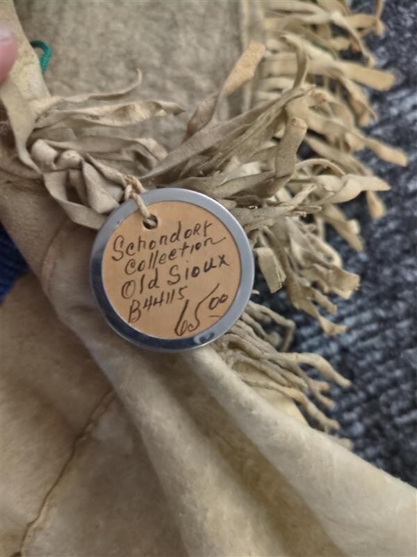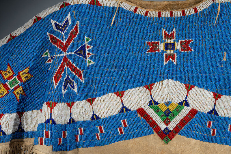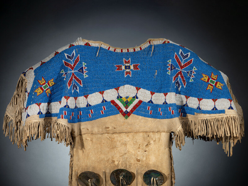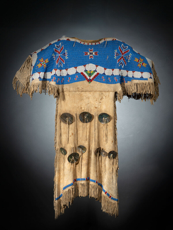 thread and sinew-sewn softly tanned hide; yoke beaded with colors of medium blue, apple red white-heart, pea green, greasy yellow, dark blue, white, and faceted marcacite; 15 large mother-of-pearl disks are attached to skirt with hide thongs