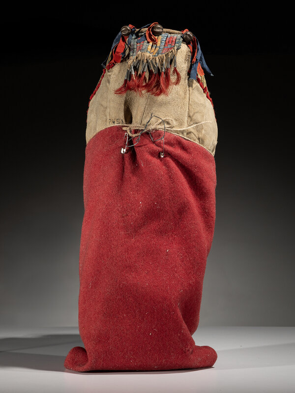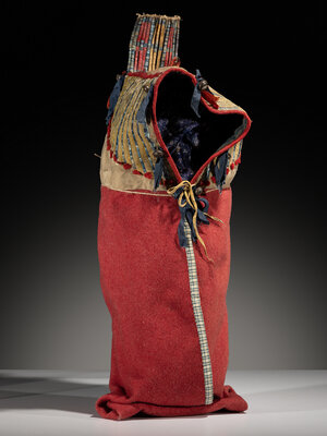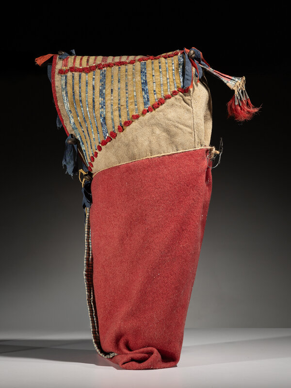 bonnet decorated with blue and red quillwork, and dotted with red tufts of wool; brass bells and blue ribbon; lined with patterned cotton; yellow pigment on hide; inked with collection number P451