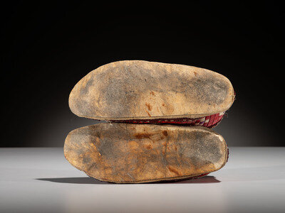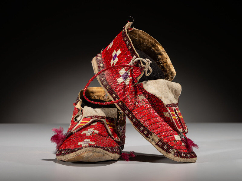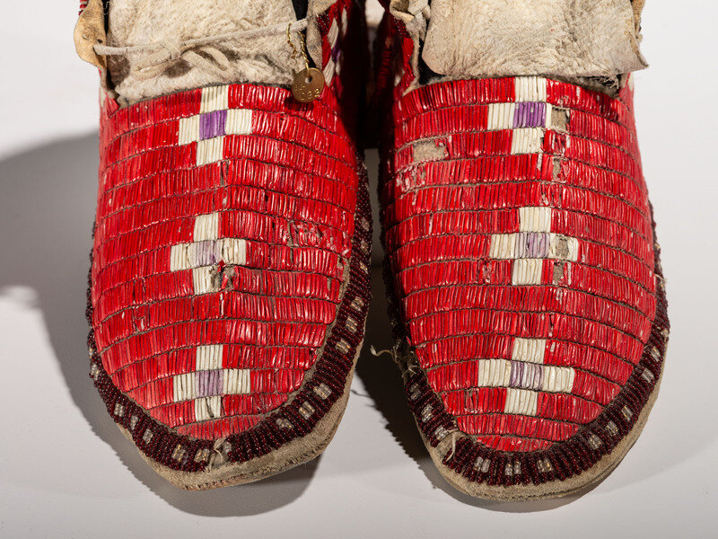 thread and sinew-sewn; fully quilled in red, white, yellow, and purple; aubergine and clear beaded lanes around cuffs and soles