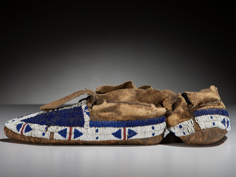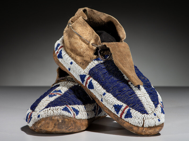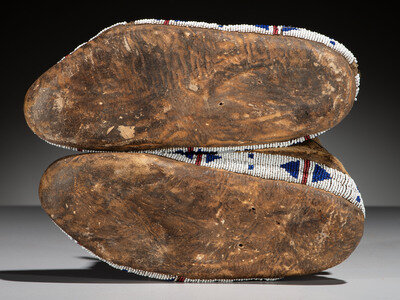 sinew-sewn and beaded in colors of dark blue, red white-heart, and white; split cuffs and triangular tongues; thick soles wrap upwards beneath beadwork