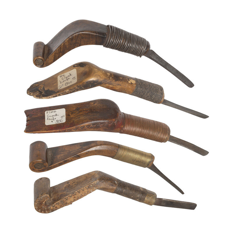 each with varying chip-carved decorations; heavily sharpened blades fixed to handles with wire or cord wrappings