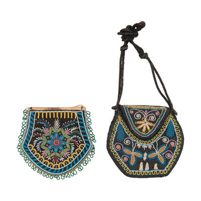 one beaded with a floral design on black velvet, edged with blue/green satin ribbon and beaded fringe; lined with a cream cotton cloth; length 5-3/4 inches x width 6-1/8 inches