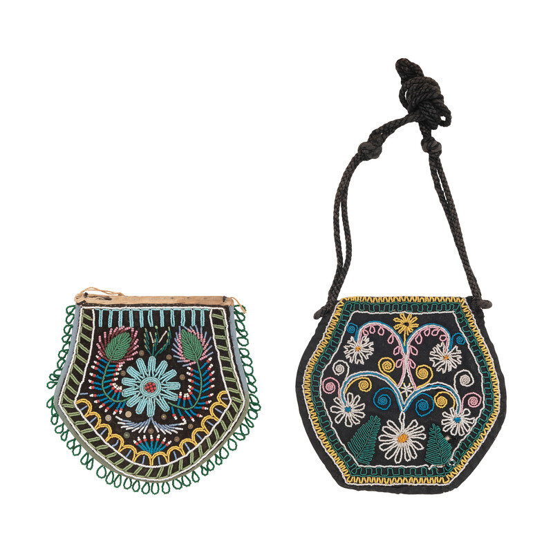 the other with a flap opening and beaded on both sides with a floral design on black wool; length 6-1/4 inches x width 6-1/2 inches