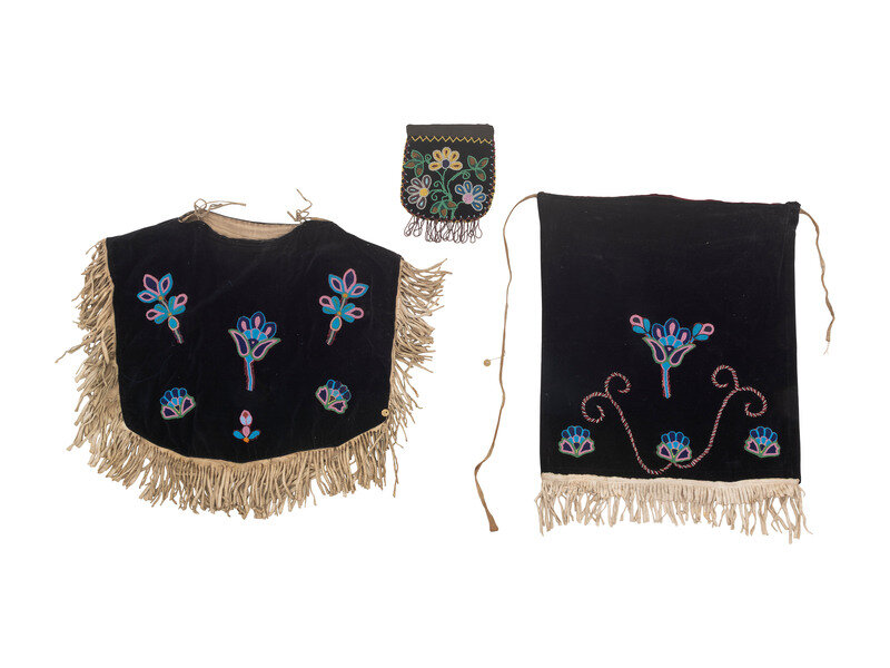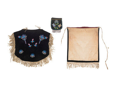 a fringed yoke, length 21 x chest 37 inches; one apron panel, length 22 x width 17-1/4 inches; AND a beaded bag, length 7 inches x width 6-1/2 inches