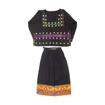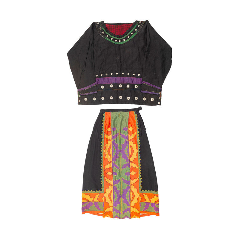 long-sleeve black shirt lined with a patterned cotton cloth, accented with purple and green satin ribbon and German silver buttons