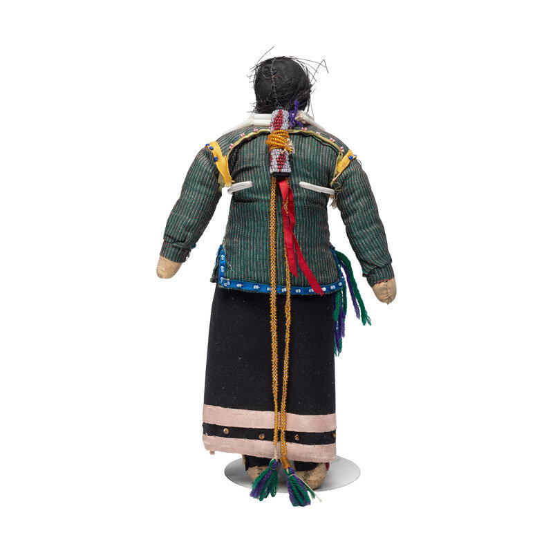 hide doll dressed in traditional clothing; ribbonwork skirt, beaded moccasins
