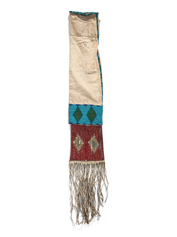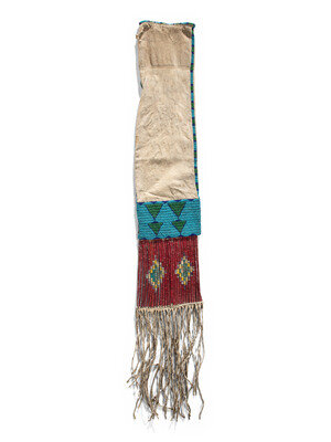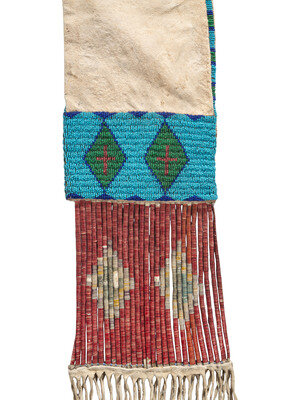 thread and sinew-sewn; flat and narrow beaded lanes in colos of dark blue, medium blue, pea green, and red white-heart; long quilled slats finish with twisted fringe