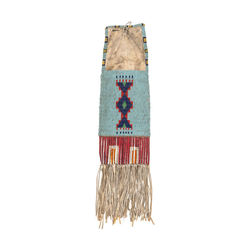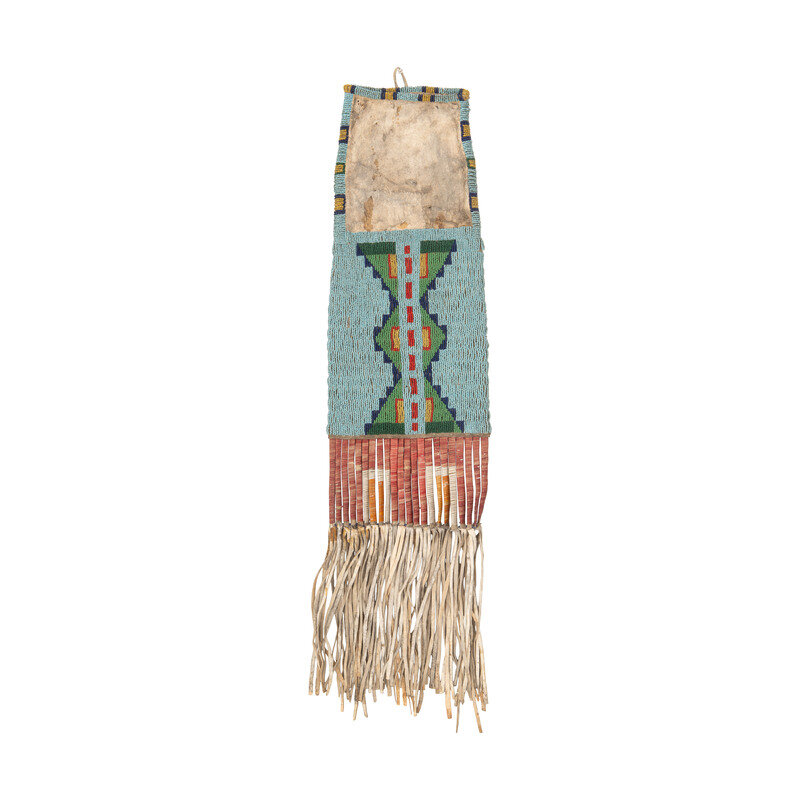 thread and sinew-sewn; beaded using colors of light and dark blue, apple red white-heart; various greens, and greasy yellow