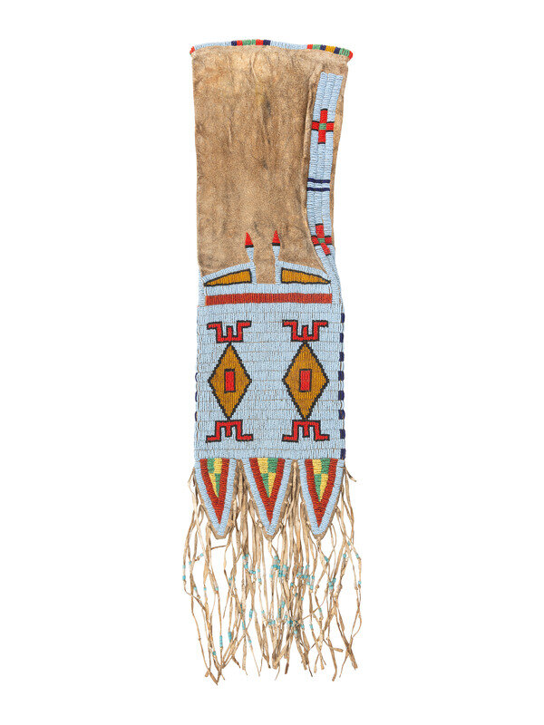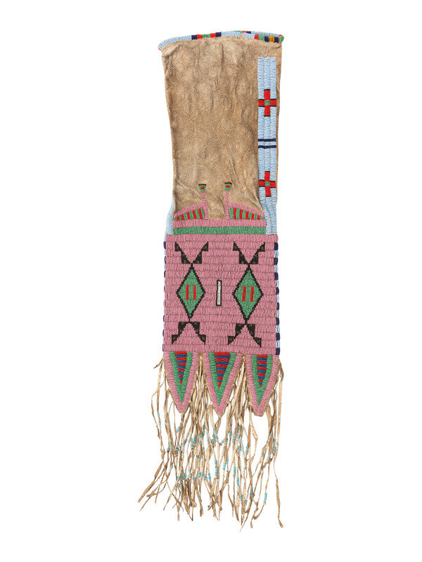 thread and sinew-sewn; heavily beaded with one side having a pink ground and light blue on the opposite; triangular tabs with fringe and basket beads