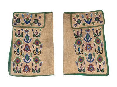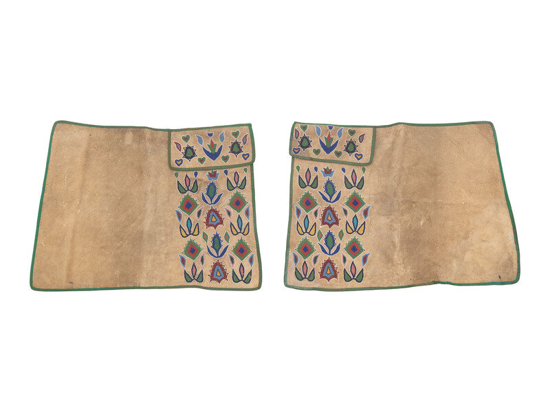 thread-sewn, softly tanned hide; florally inspired designs created with small cut beads; silk ribbon edging; polished cotton lining