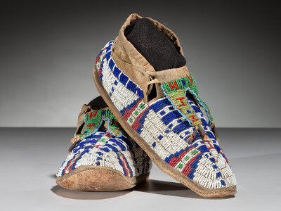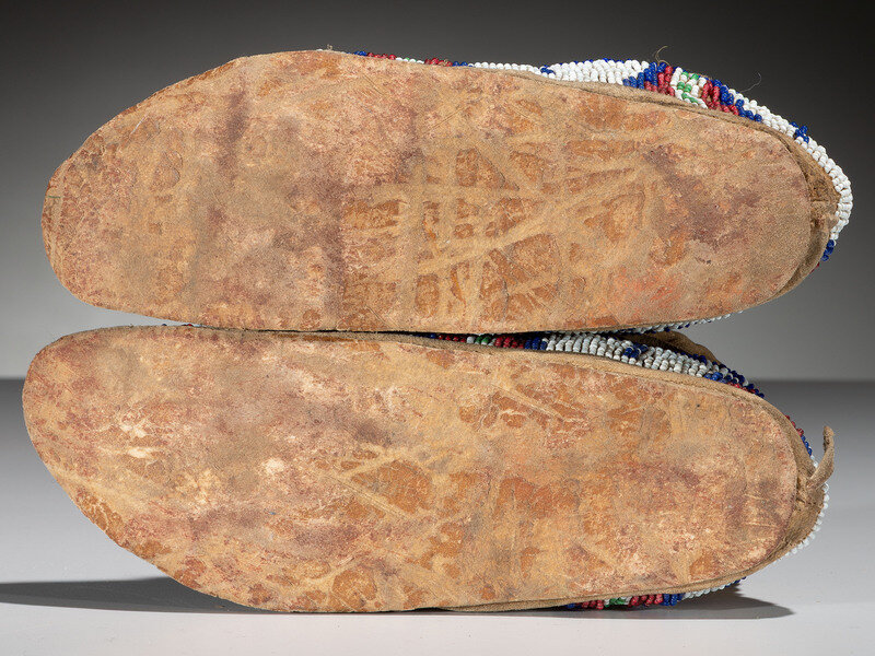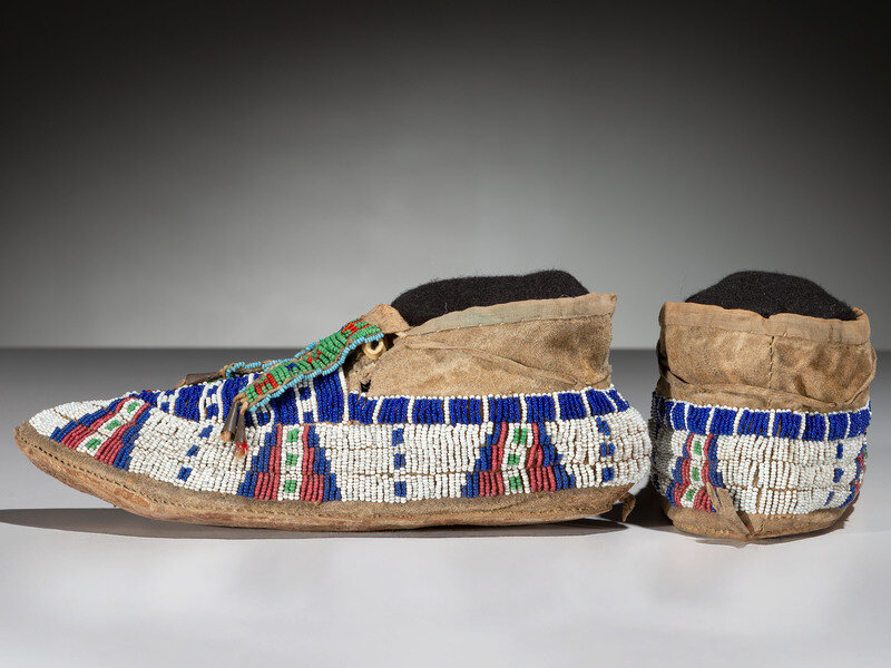 thread and sinew-sewn; beaded in colors of red white-heart, dark blue, various greens, and white; cotton edging along cuff; tin cones