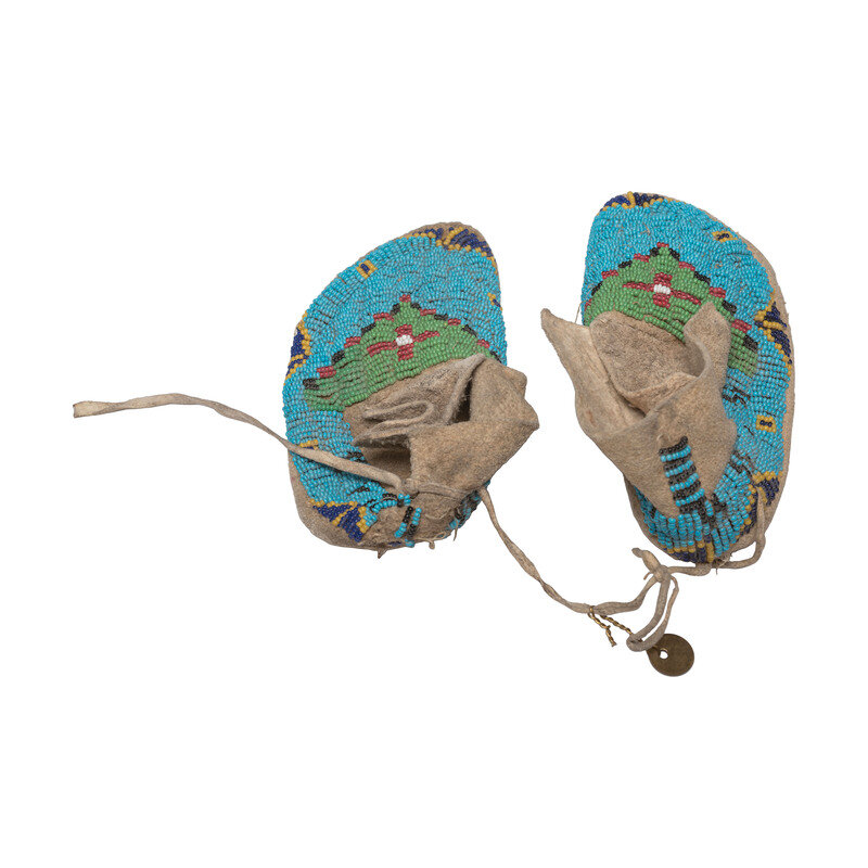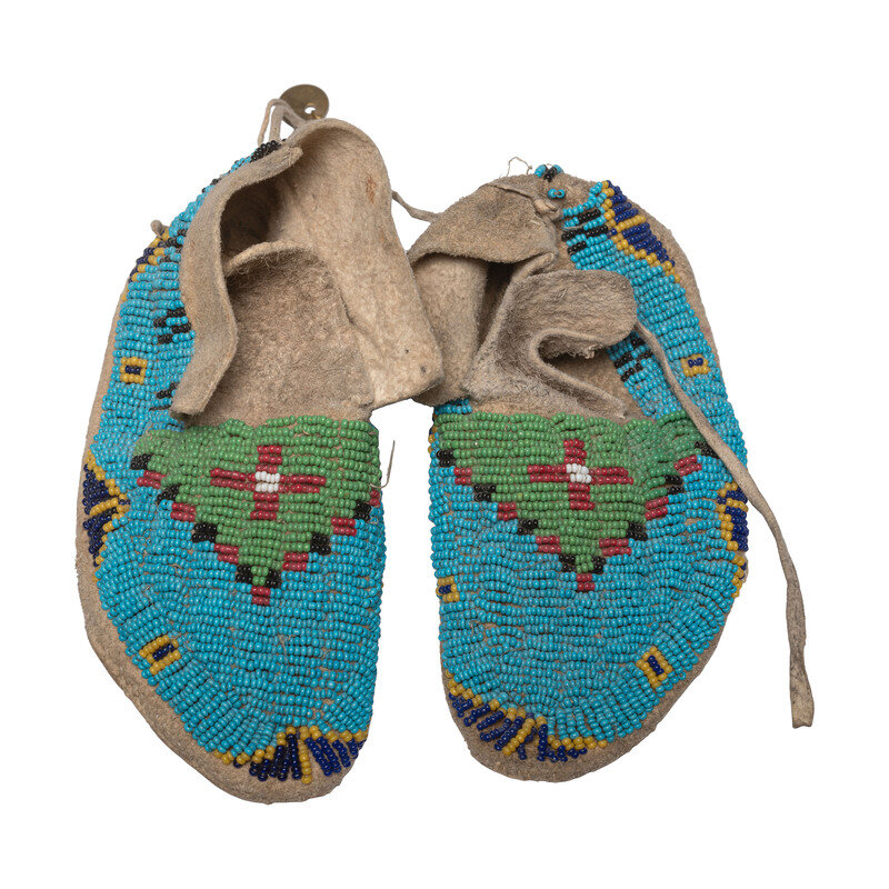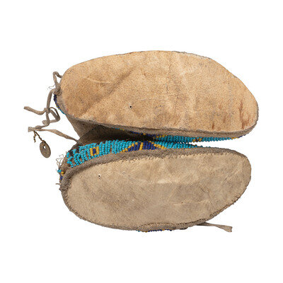 sinew-sewn and beaded with colors of light blue, pea green, red white-heart, greasy yellow, and dark blue